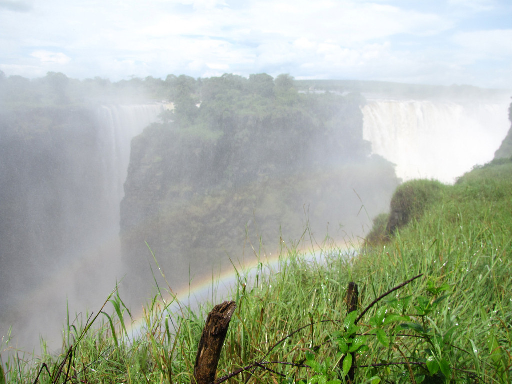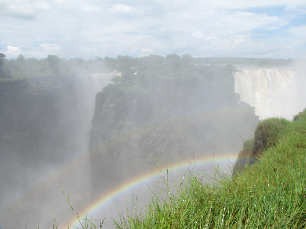 手持雨伞,步行过桥的照片是最为难忘的经历,由于瀑布的水雾,就像瓢泼大雨一样,不打雨伞是无法通过的,由于我们的使馆朋友的“有预见”,我们很顺利的走过桥,看了瀑布,留下彩虹当空的照片,在十几分钟内跨过激湍,跨过瀑布,来到瀑布的另一端津巴布韦。