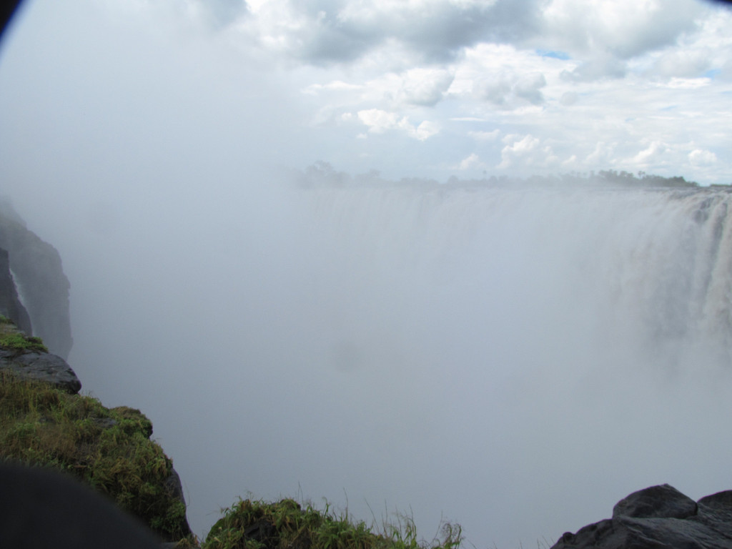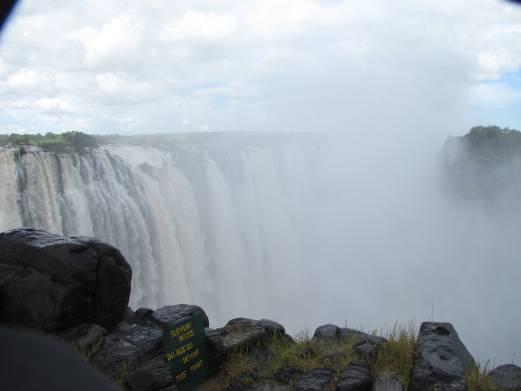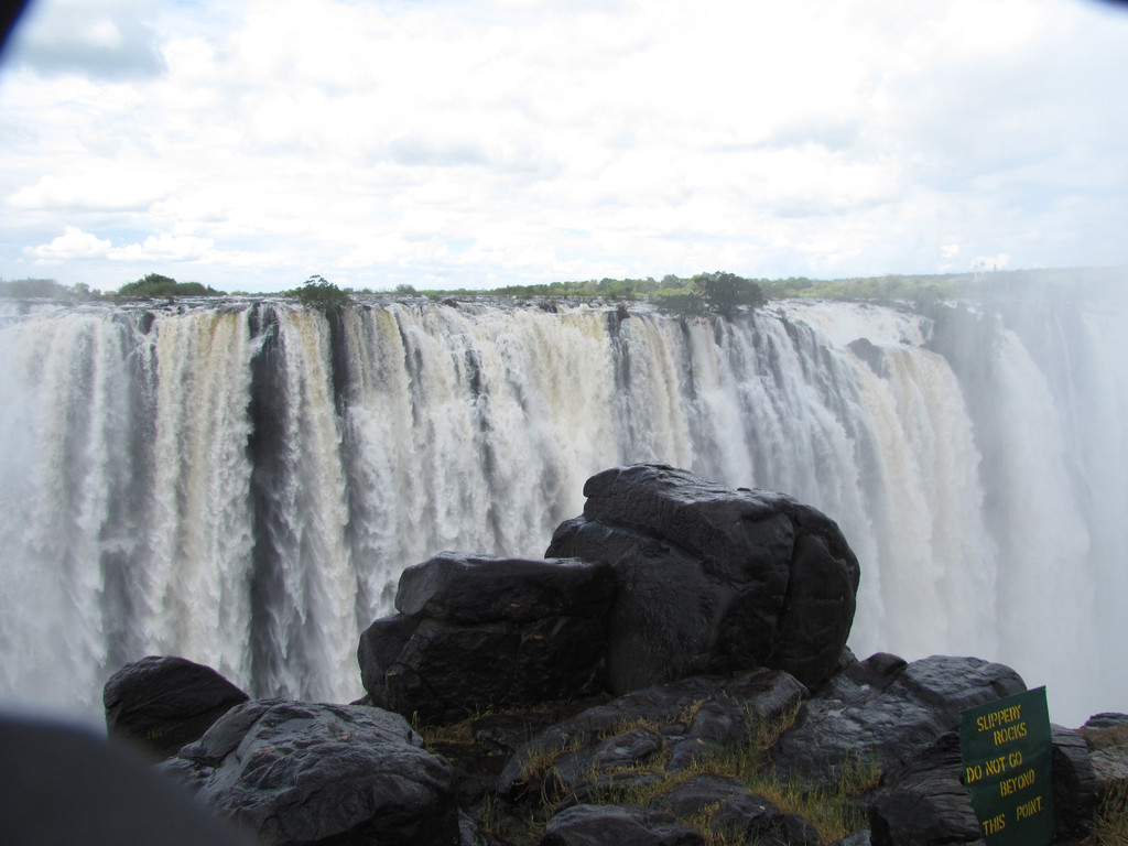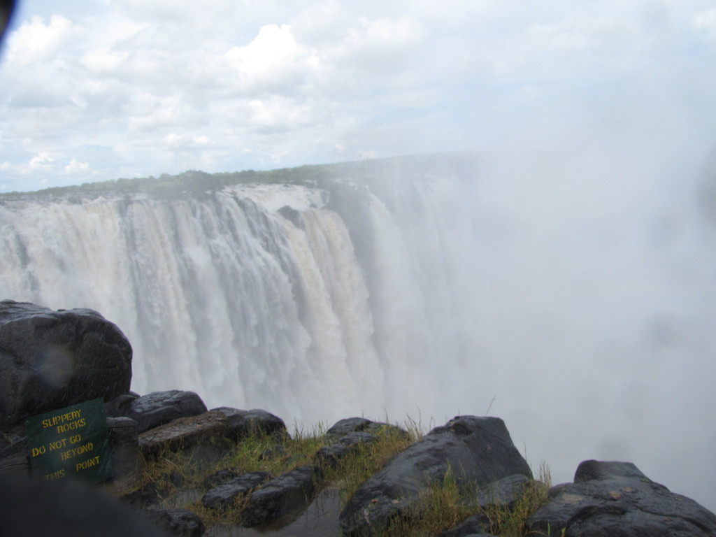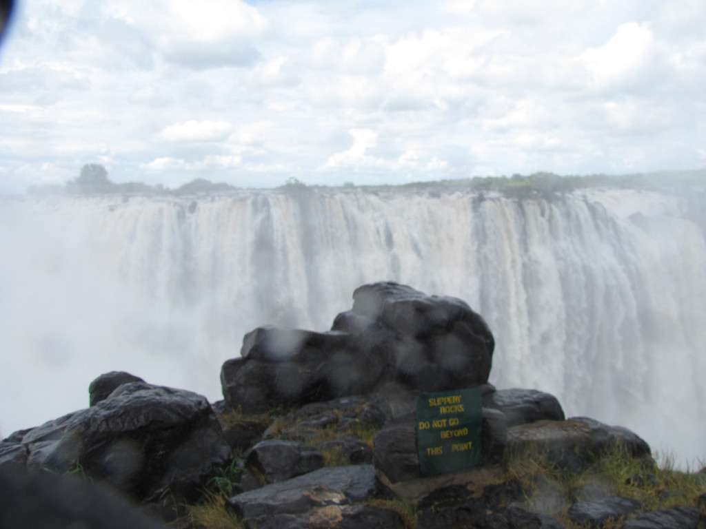 蔚为大观的维多利亚大瀑布可以说是世界奇观,姑且不说它的水量,它的瀑布的落差,仅仅是声音就足以让你震撼。从卢萨卡开车,经历了非洲大草原的奇景,看到各种动物从眼前穿过,公路上经常看到的都是长颈鹿或者是非洲雄狮的身影。距离瀑布还有十公里的时候,巨大的瀑布声音已经响在耳边,震耳欲聋。我们所住的“飞毛腿宾馆”,基本就是喊着说话,否则会影响听觉。后来,就像住在火车道旁边的公寓楼一样,习惯了,也就不用喊了。