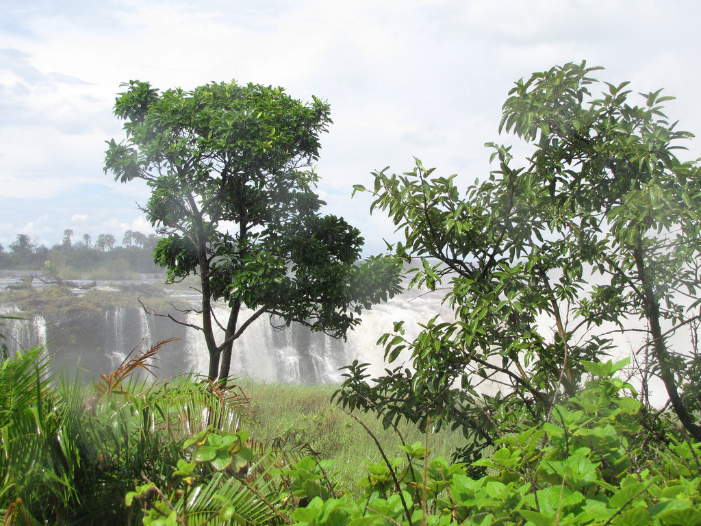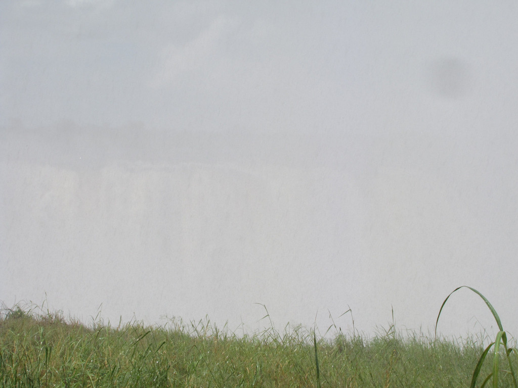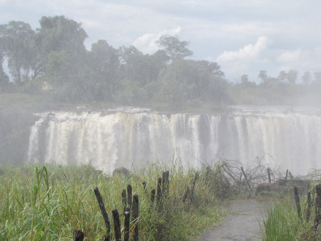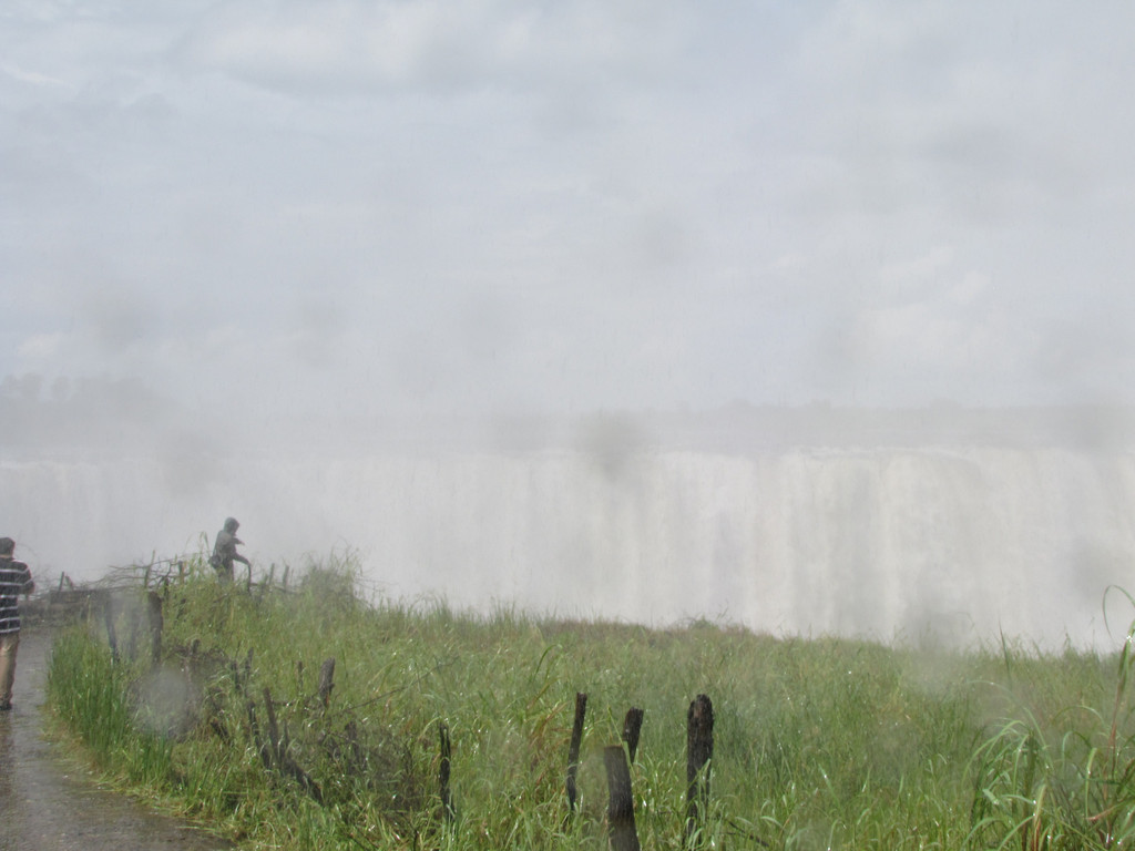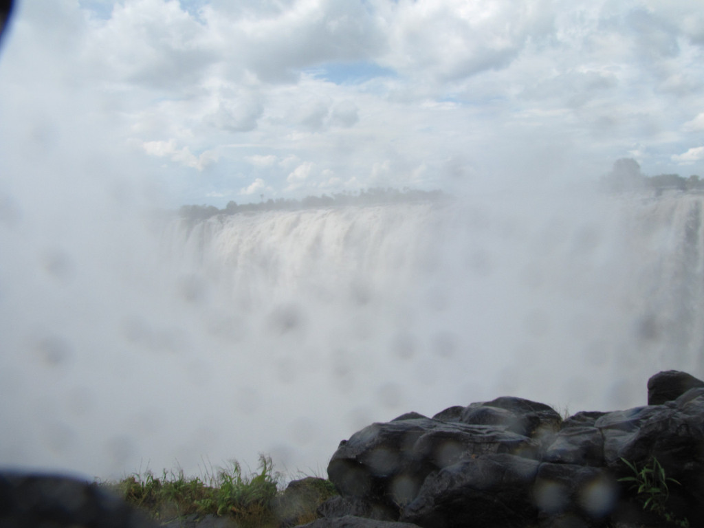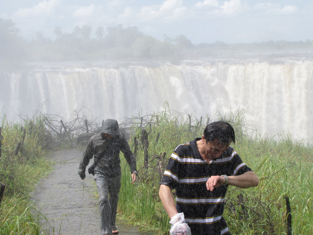 手持雨伞,步行过桥的照片是最为难忘的经历,由于瀑布的水雾,就像瓢泼大雨一样,不打雨伞是无法通过的,由于我们的使馆朋友的“有预见”,我们很顺利的走过桥,看了瀑布,留下彩虹当空的照片,在十几分钟内跨过激湍,跨过瀑布,来到瀑布的另一端津巴布韦。