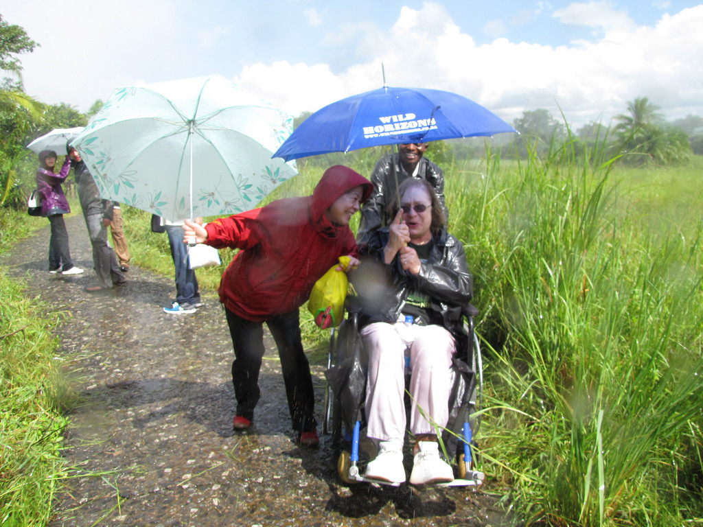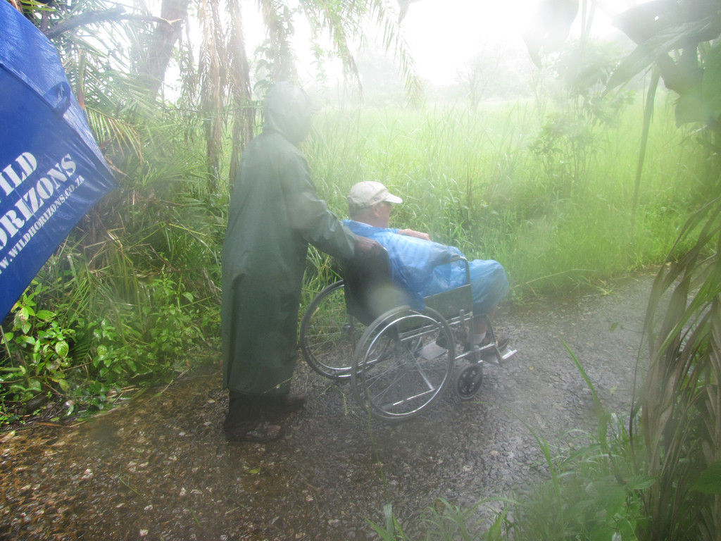 在这里我们遇到一对坐着轮椅,被非洲黑人手推车来到瀑布前的外国老人夫妇,他们来自美国。学英语出身的老伴看到他们后搭讪,知道他们虽已经年迈,可是仍然要不辞辛苦,不怕花钱从遥远的美国来此观看,雇人推车,价钱不菲,可是满足了自己对大自然造化之奇妙的感觉,领略大自然的威力。