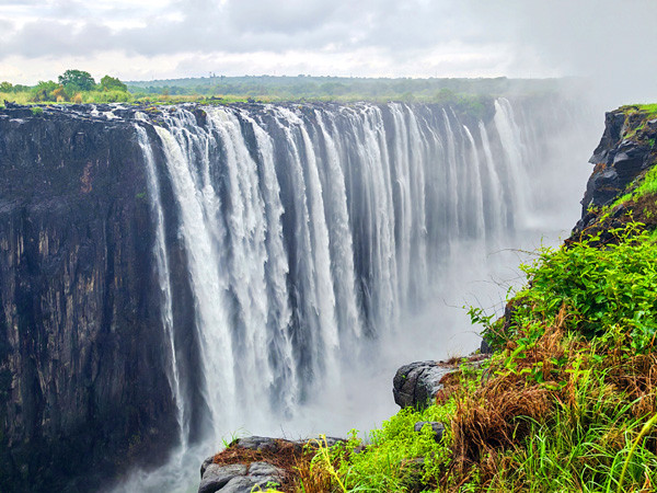 终于,维多利亚大瀑布的全景,相继毫无保留地展现在我的眼前。那一刻,我感觉自己的呼吸都停滞了,整个世界仿佛只剩下眼前这一片波澜壮阔的水幕。只见宽阔的赞比西河奔腾至此,像是被一股无形的力量猛然推动,义无反顾地从百米高的悬崖边缘飞泻而下。