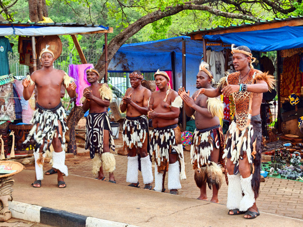 之后,继续驱车前行,只用了十分钟左右,就到达了津巴布韦维多利亚大瀑布风景区。景区外有一些身着民族服装的当地青年人,载歌载舞地欢迎游客们的到来。