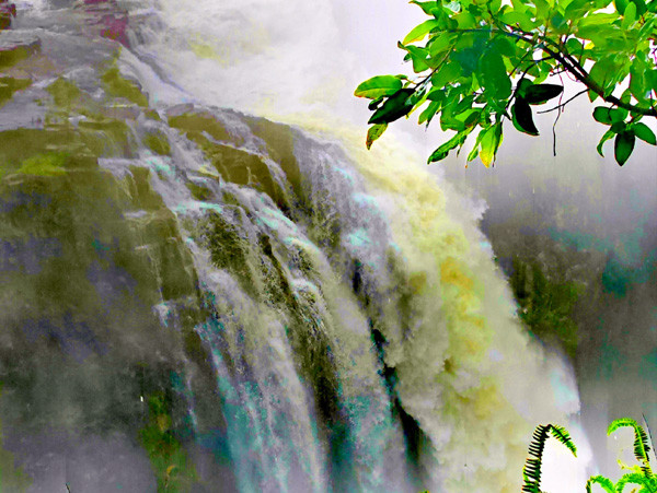 由于当日进园前天气阴沉沉,故此,发给每位团友一件雨衣,谁知大家刚进园,大雨如注开始倾盆而下,于是只能是冒雨观景了。然而刚刚靠近瀑布,那磅礴的轰鸣声便远远地传来,好似千军万马奔腾而过,又似滚滚天雷在耳边炸响。