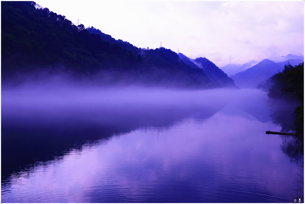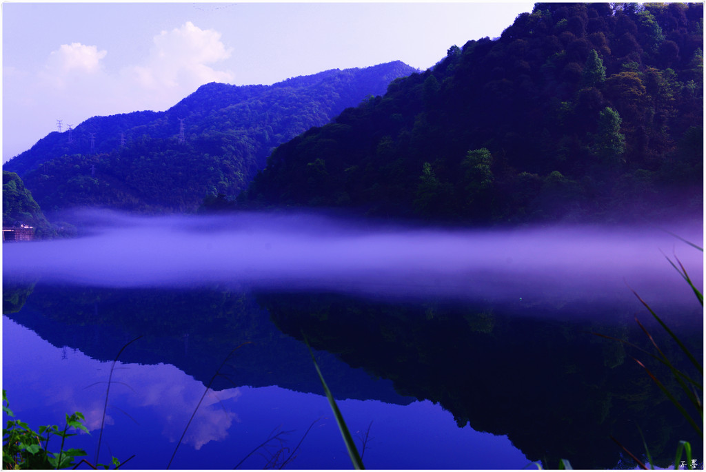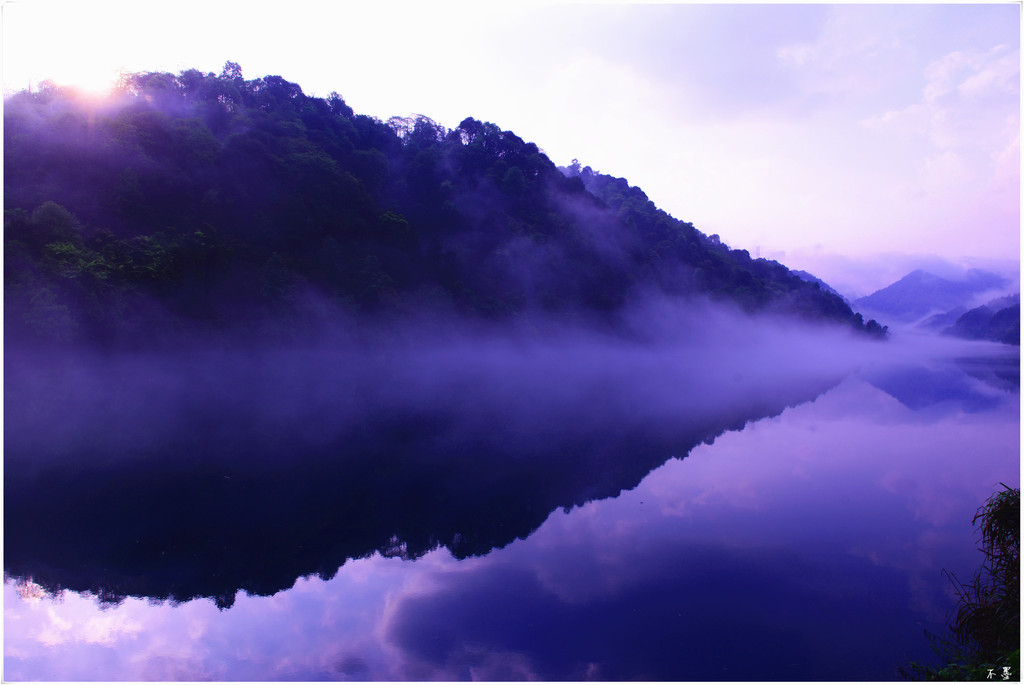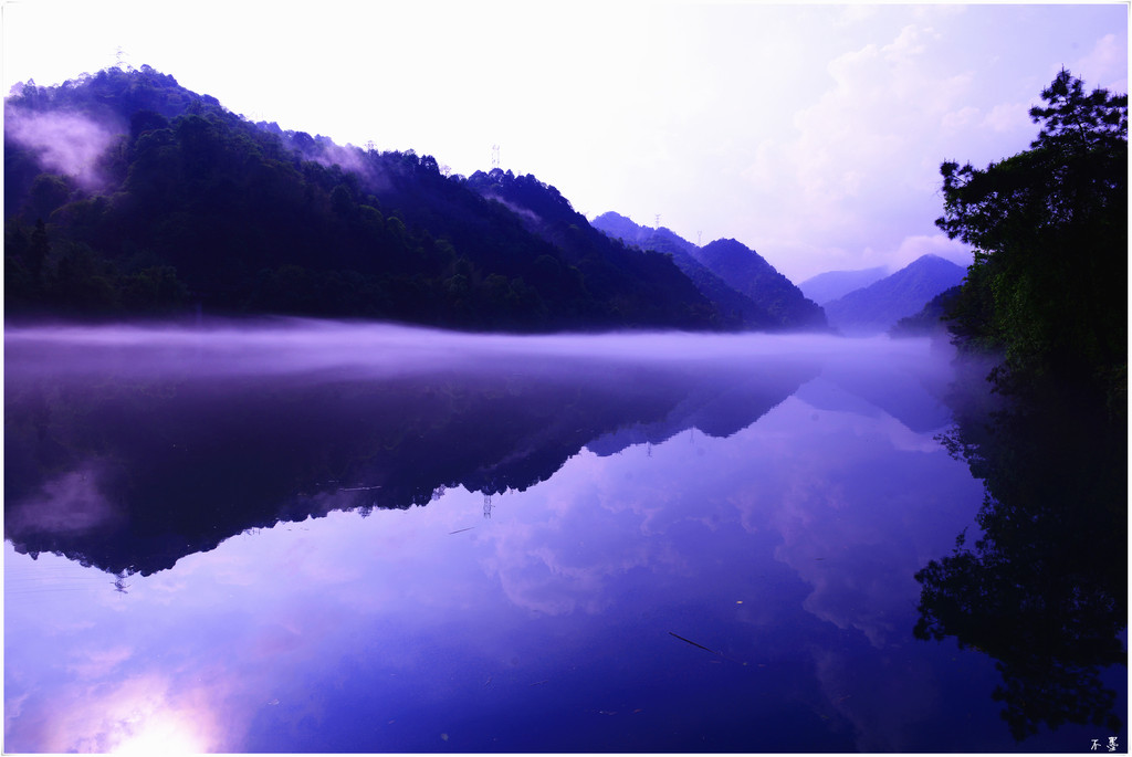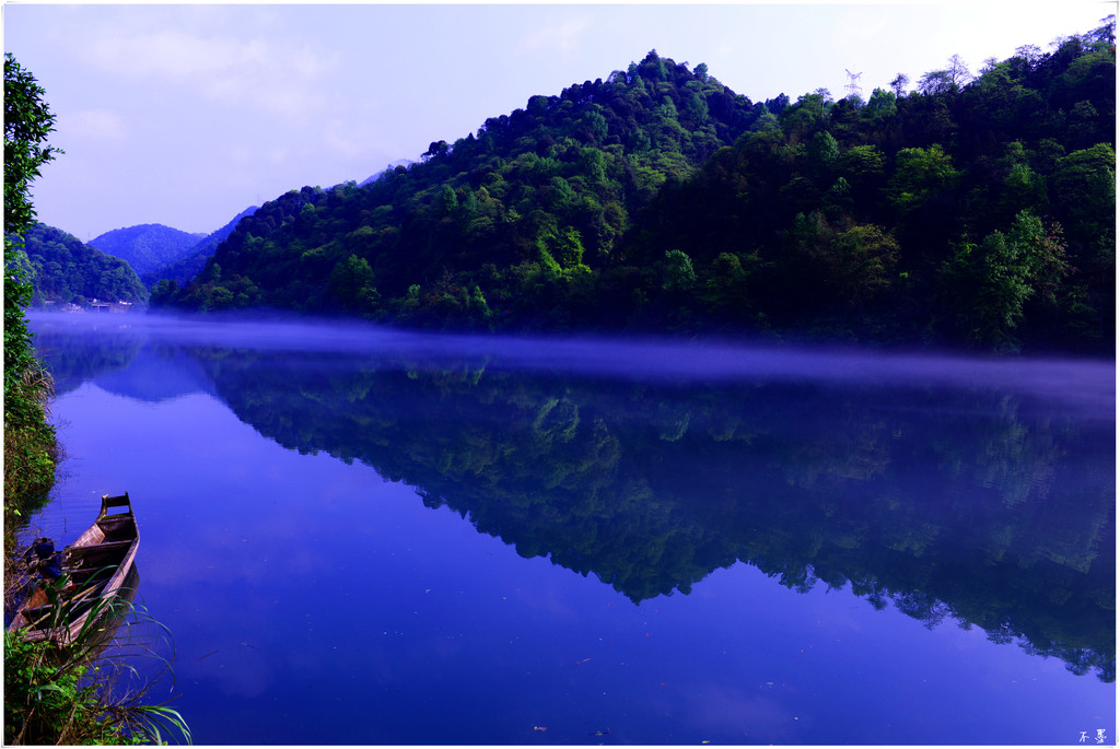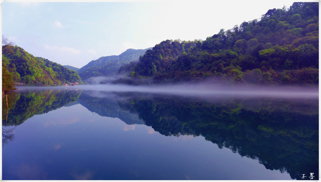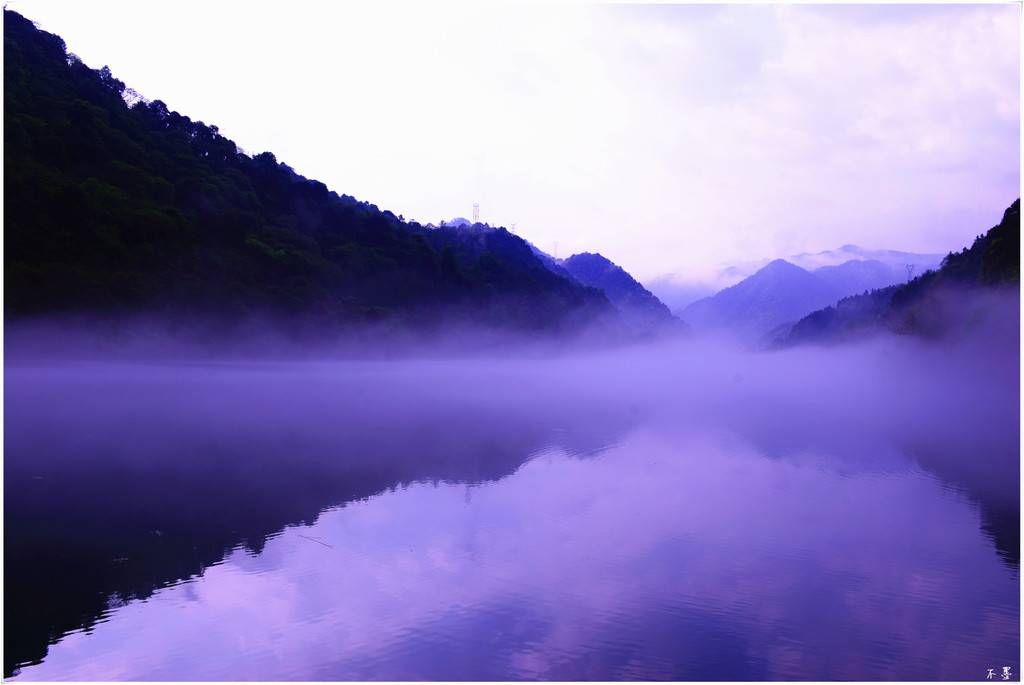 小东江清澈、澄碧,幽静的江面雾气蒸腾,如娇羞新娘身披轻柔的白纱,白纱把江水和山峦分隔开来,山峦又似跌落水中,宛若梦幻般。