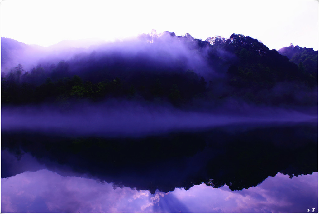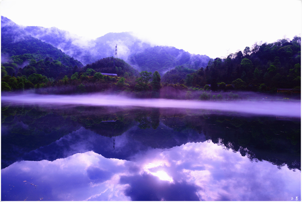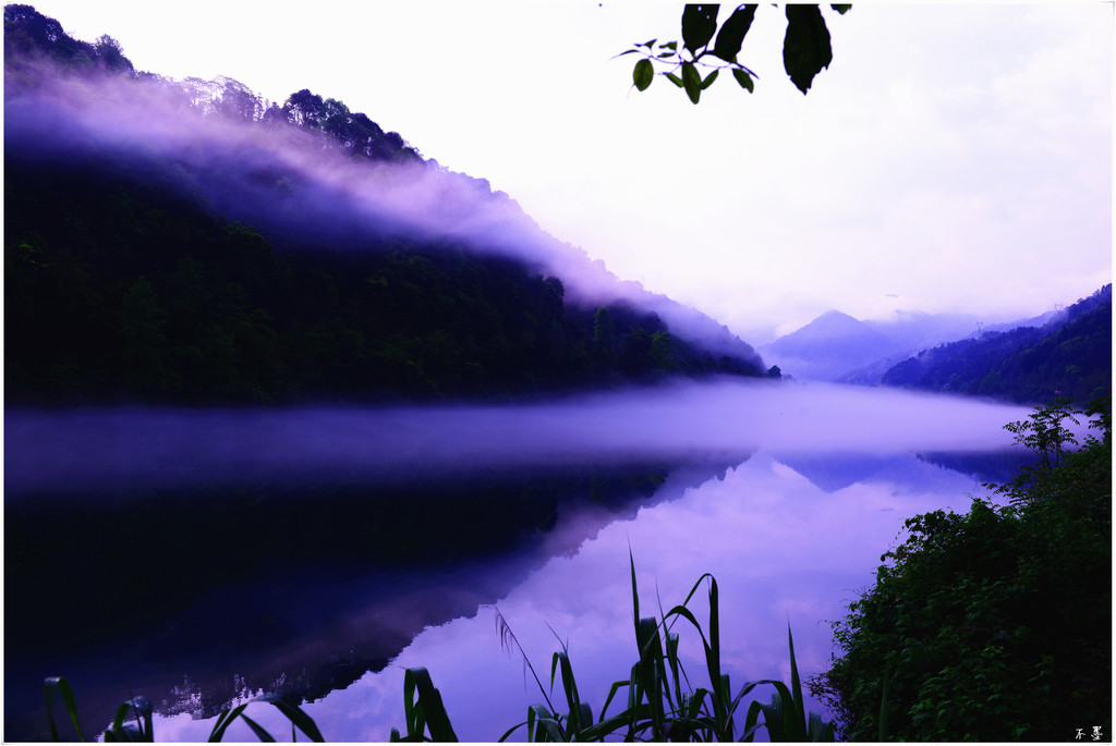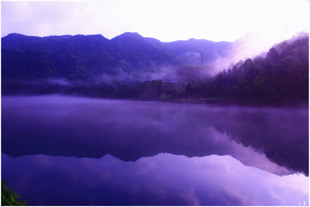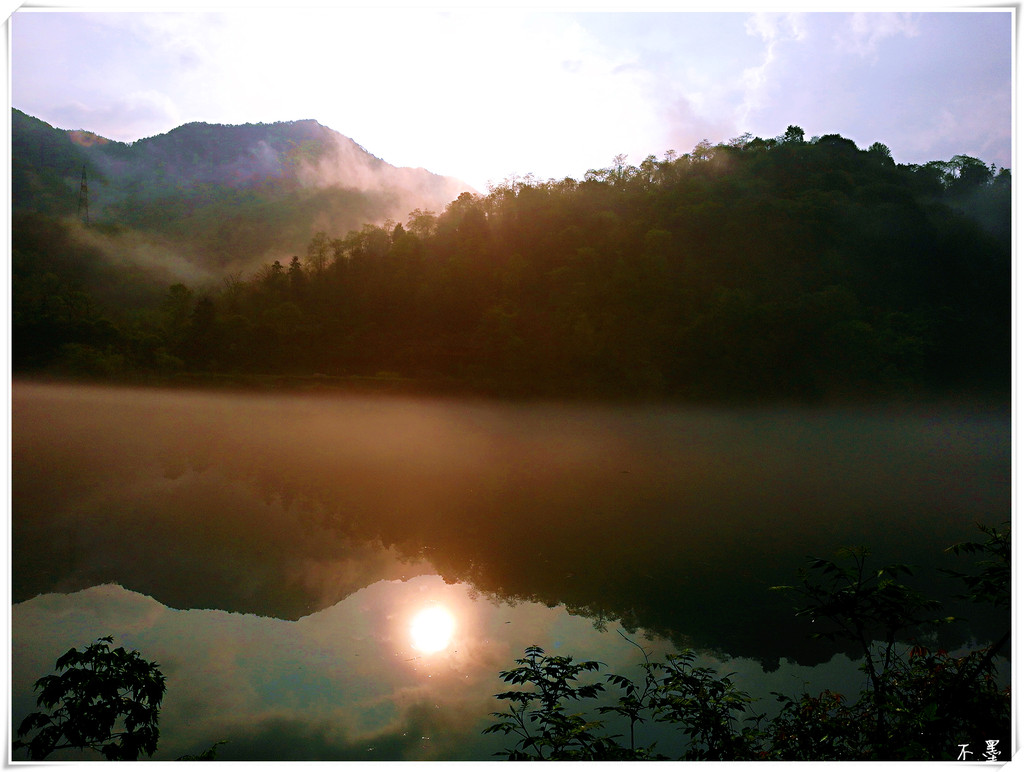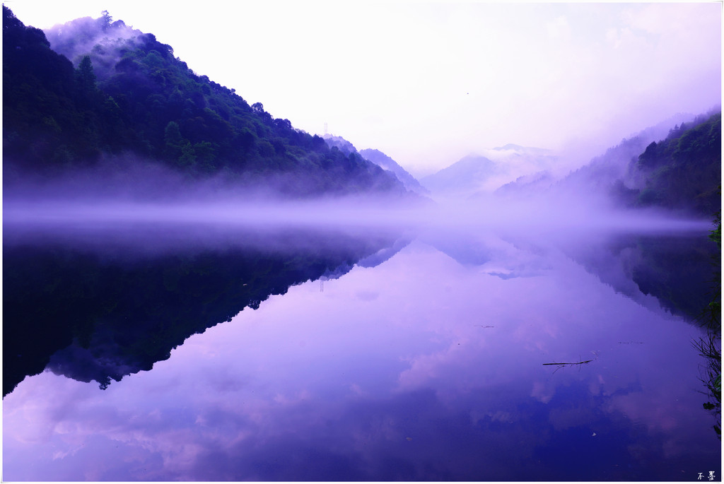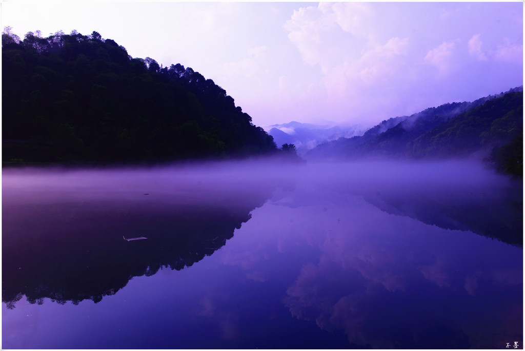 小东江清澈、澄碧,幽静的江面雾气蒸腾,如娇羞新娘身披轻柔的白纱,白纱把江水和山峦分隔开来,山峦又似跌落水中,宛若梦幻般。