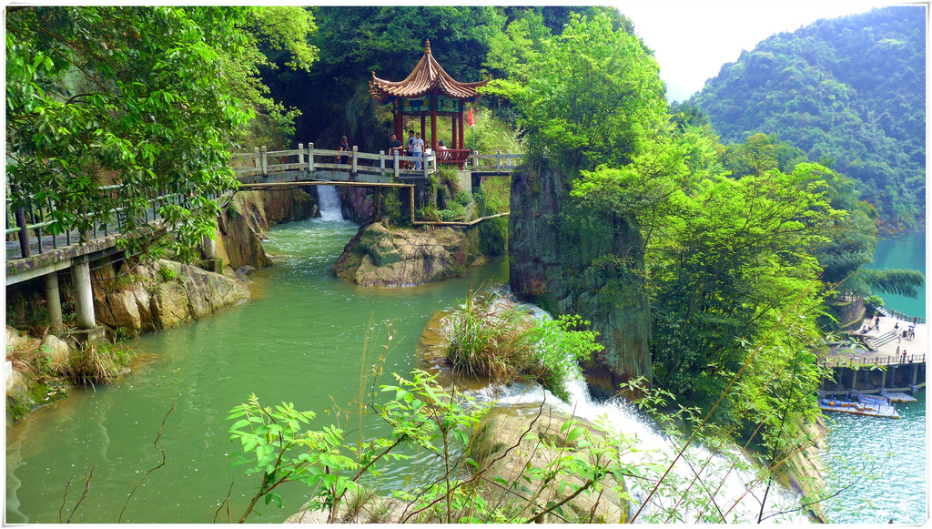 过东江湖游船码头不远既达龙景峡谷景区,峡谷全线游程2.5公里,谷内瀑布密布,山水相映,是一处天然氧吧。