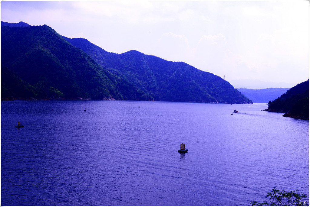 东江湖“一坝锁东江,高峡出平湖”,湖面浩翰、青山叠翠,有如长江三峡的气势,更比三峡多了份柔美、恬静。