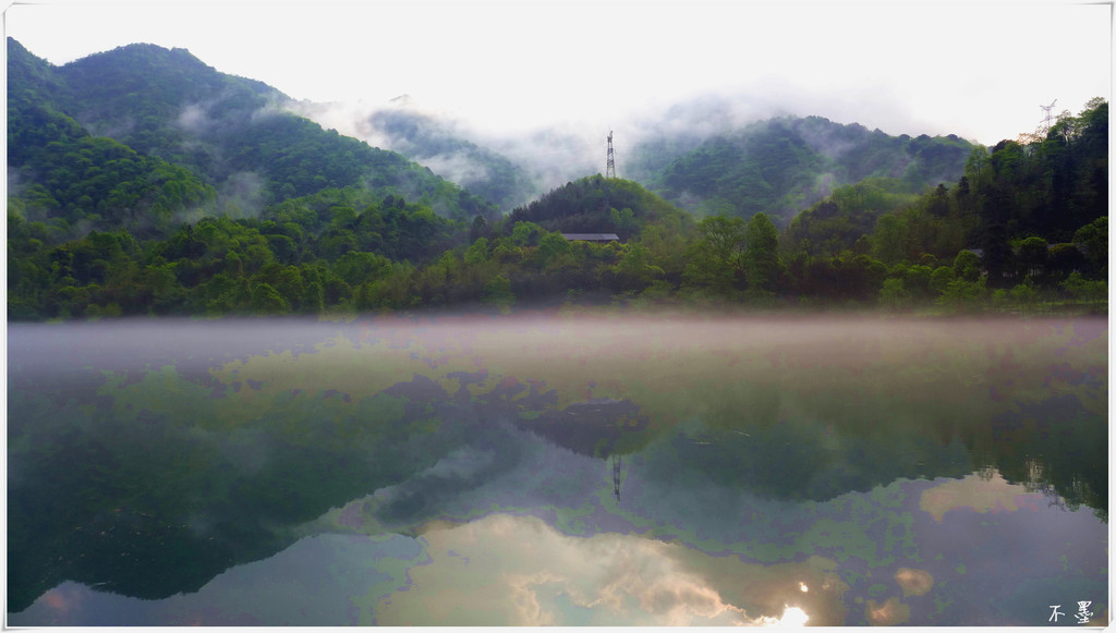 太阳升高,雾气渐淡,云染上霞光,水中色彩靓起来。