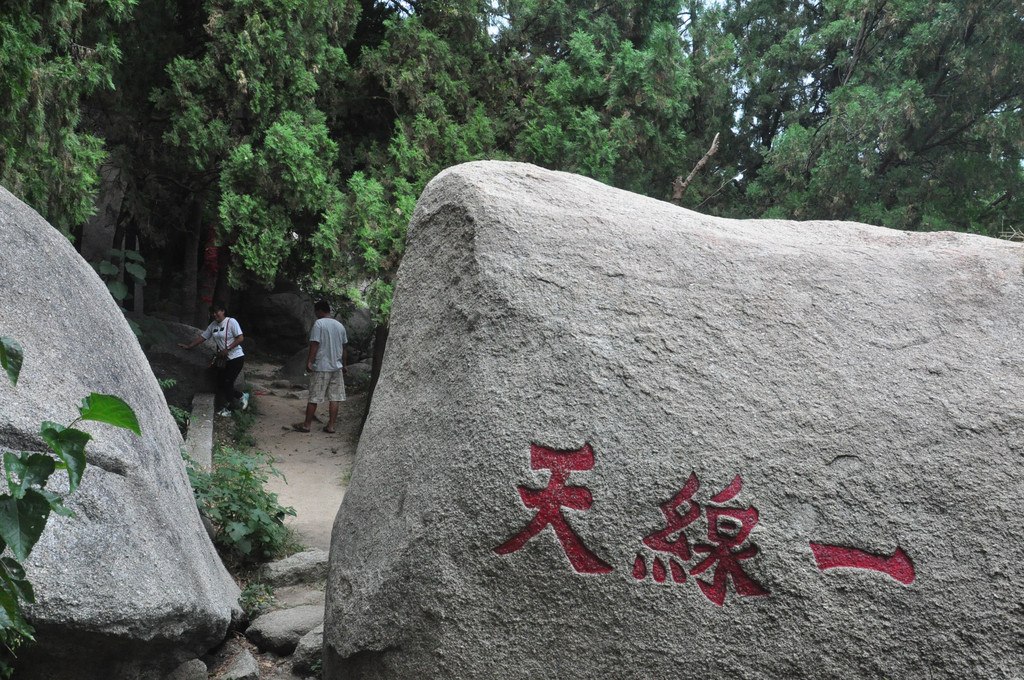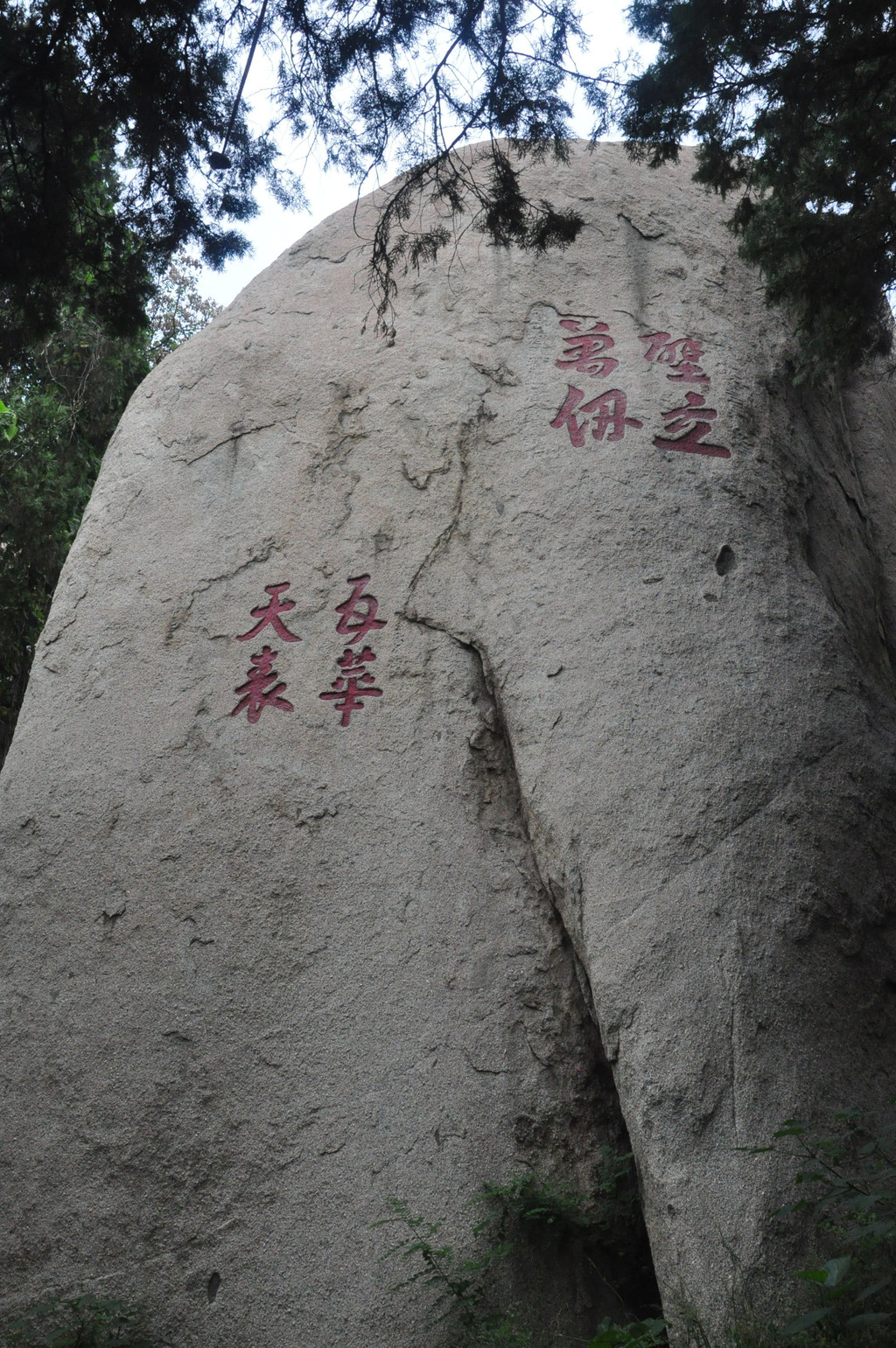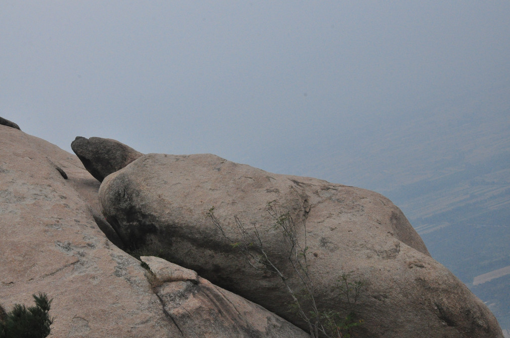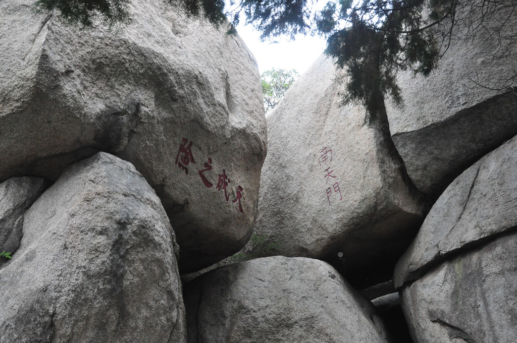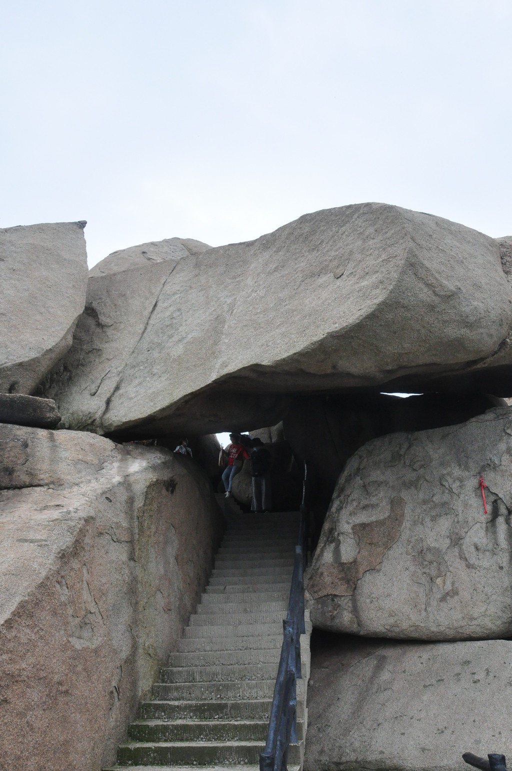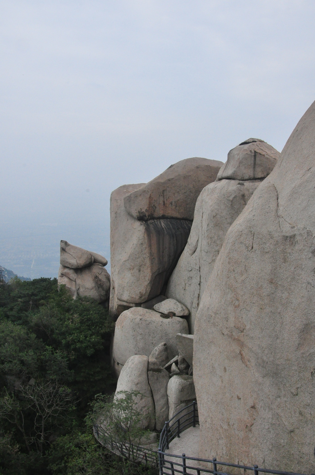 我们上午10点半乘索道到达南天门,走五华峰、丹丸峰、鳌字到小鲁台,然后走东宫、一线天、舍身崖,由西路下山。山上最险处为五华峰,山石凿出的道路,崎岖蜿蜒,还要钻过山洞石缝,才能到达一条新修的栈道,沿台阶而下,可到小鲁台,如果在东宫一路下行亦可到西门,我们选择走一线天,一线天简直是误导,就是两块石头中间有一条缝,太会糊弄人了,结果又上行攀登至南天门,这一上一下,再上,就有点让人感到疲惫之至,还是由东宫直接下山为好。有再去的朋友,可作参考。