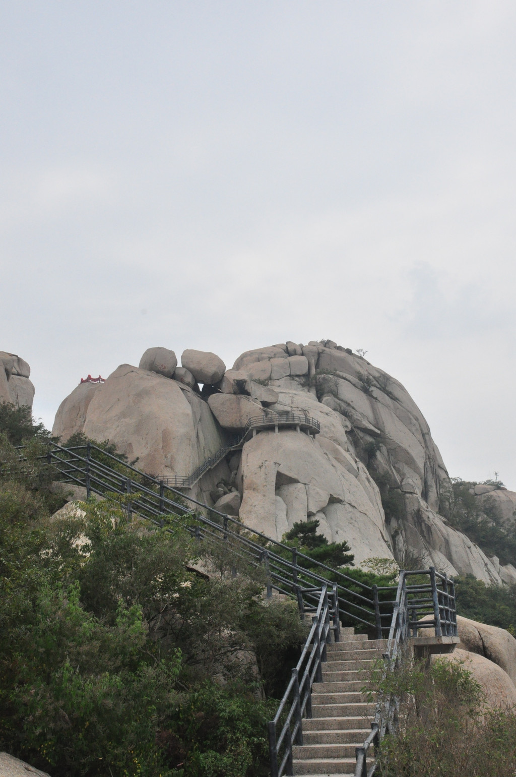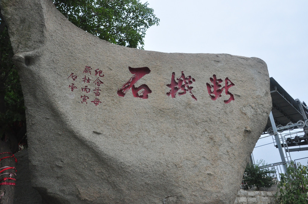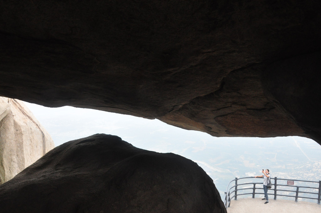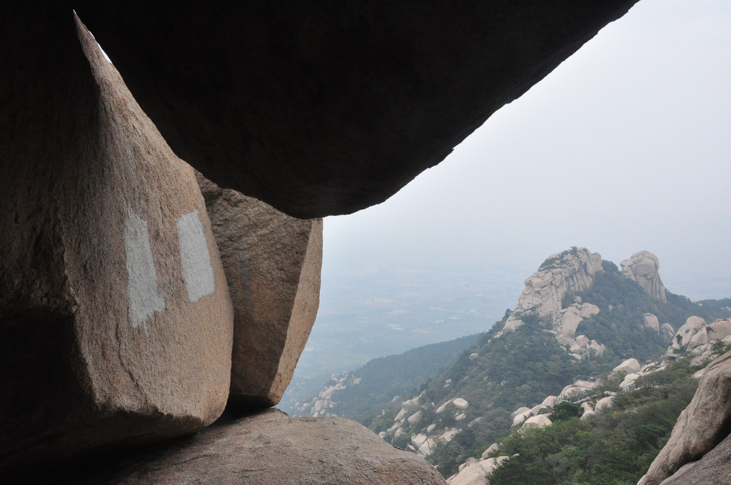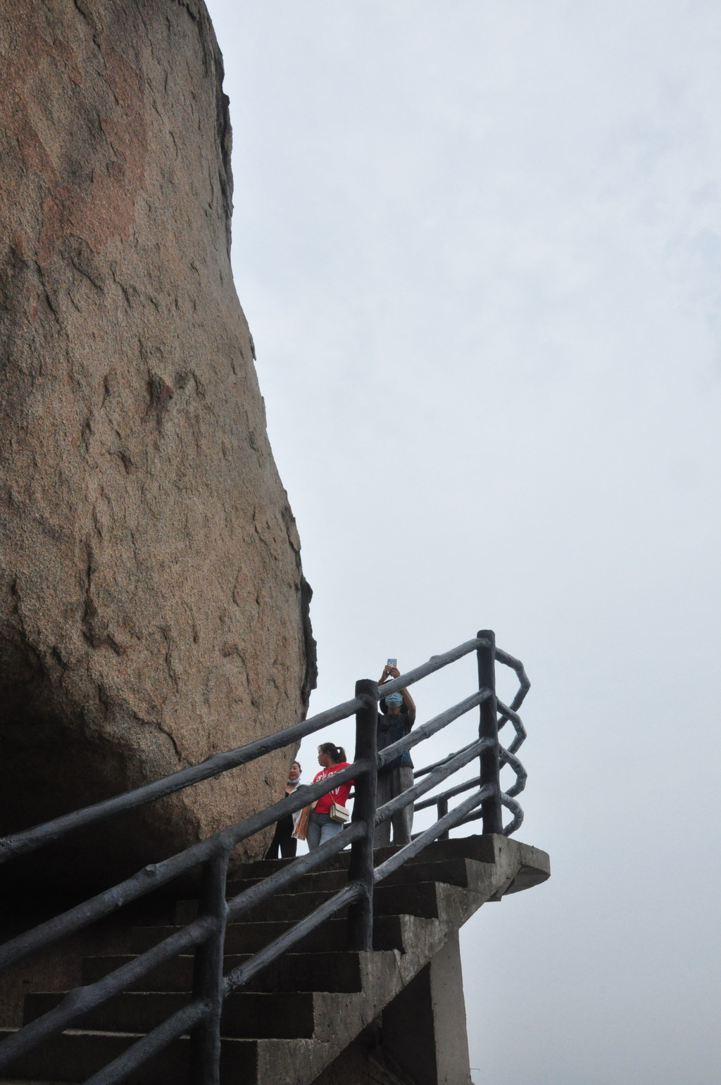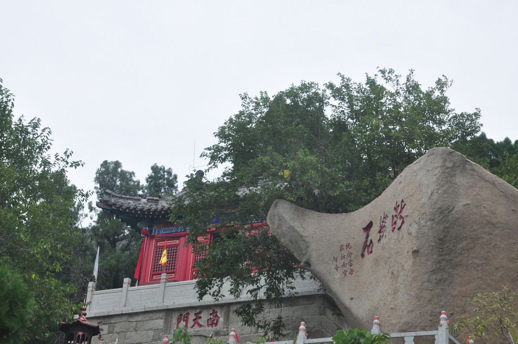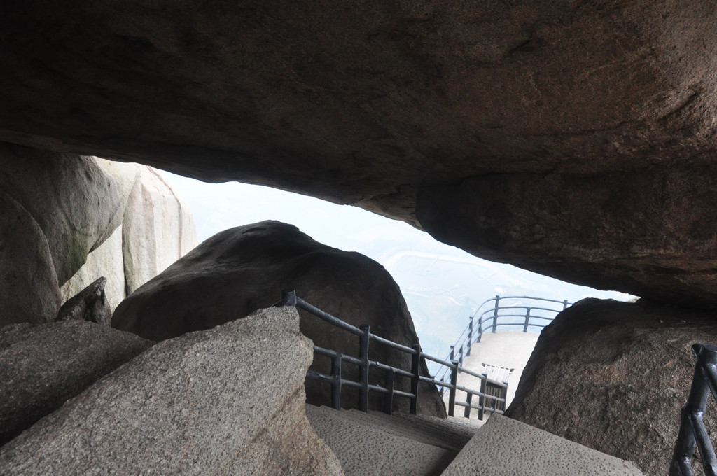 我们上午10点半乘索道到达南天门,走五华峰、丹丸峰、鳌字到小鲁台,然后走东宫、一线天、舍身崖,由西路下山。山上最险处为五华峰,山石凿出的道路,崎岖蜿蜒,还要钻过山洞石缝,才能到达一条新修的栈道,沿台阶而下,可到小鲁台,如果在东宫一路下行亦可到西门,我们选择走一线天,一线天简直是误导,就是两块石头中间有一条缝,太会糊弄人了,结果又上行攀登至南天门,这一上一下,再上,就有点让人感到疲惫之至,还是由东宫直接下山为好。有再去的朋友,可作参考。