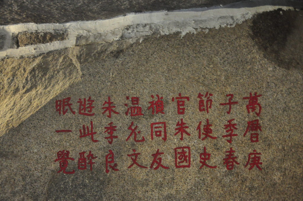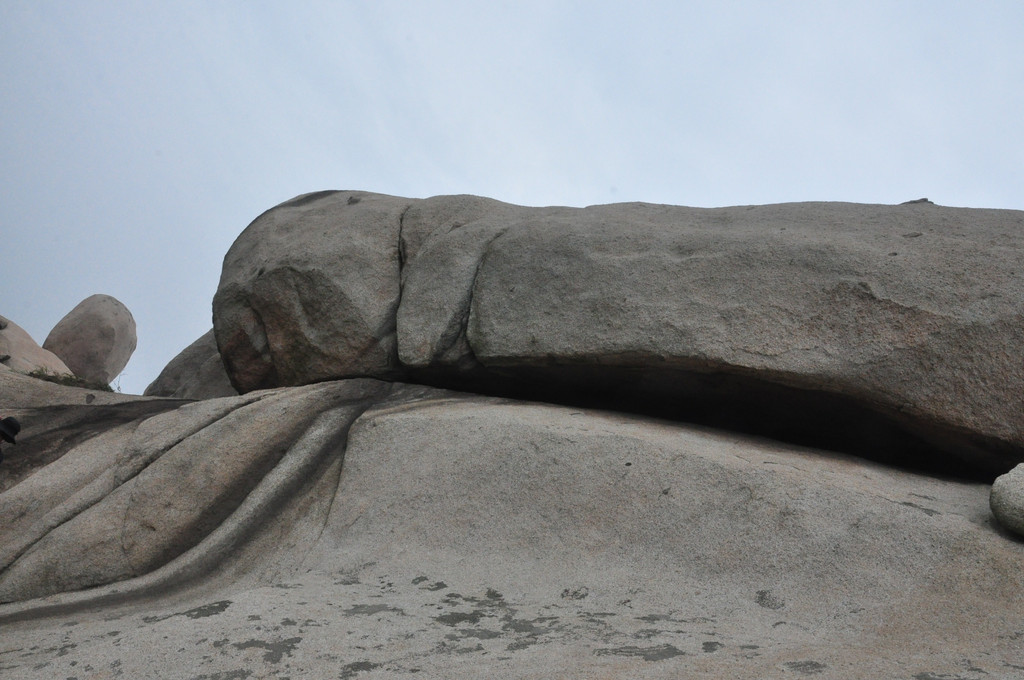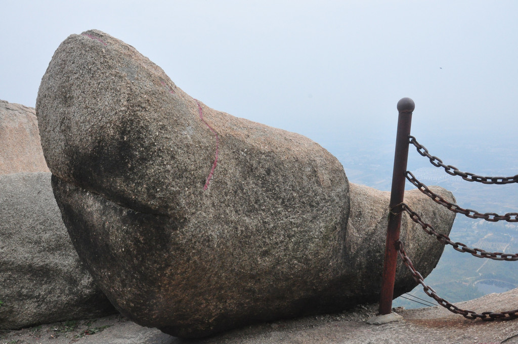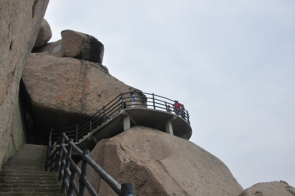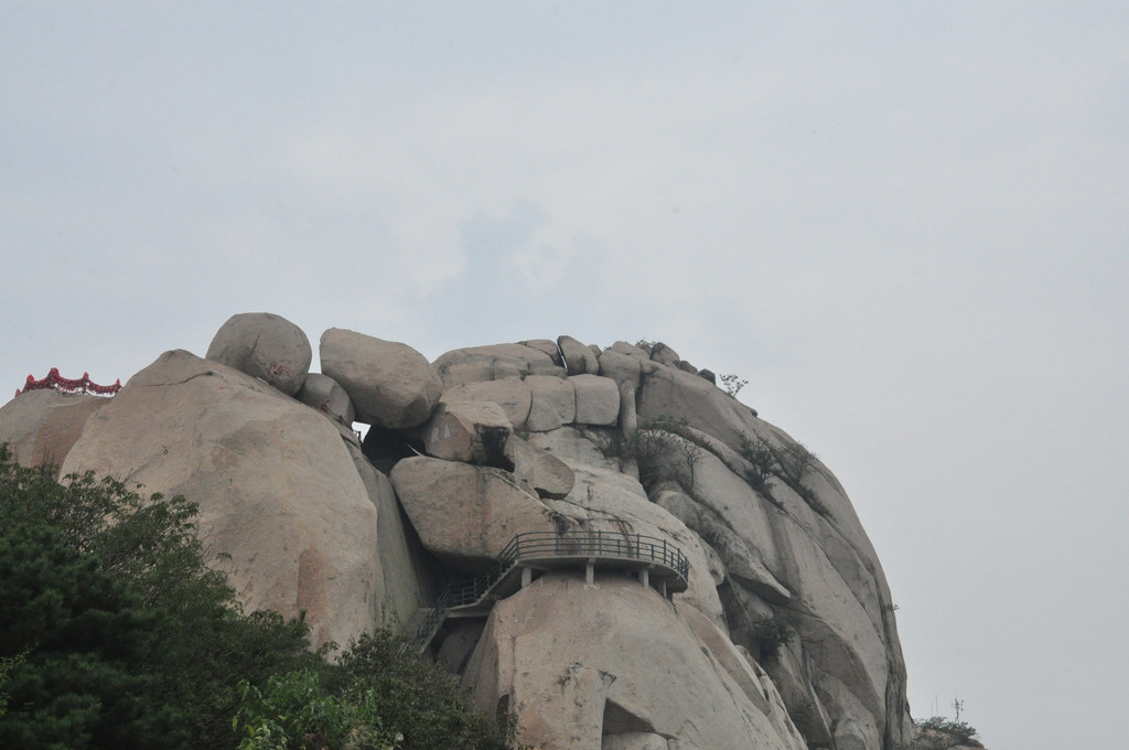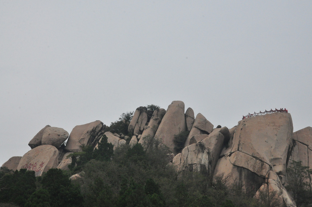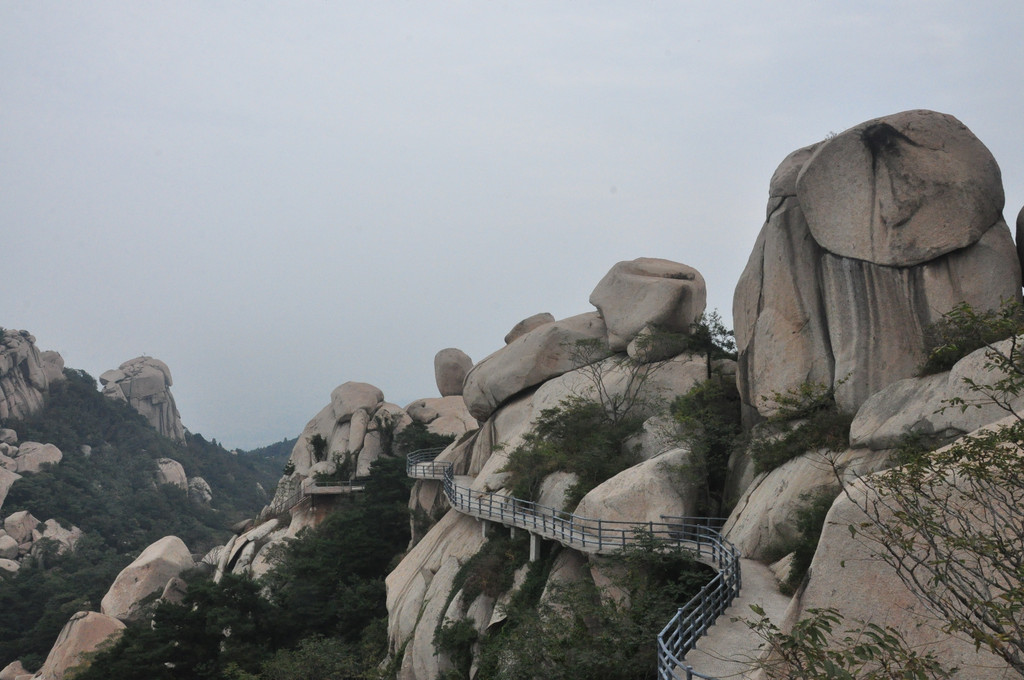 我们上午10点半乘索道到达南天门,走五华峰、丹丸峰、鳌字到小鲁台,然后走东宫、一线天、舍身崖,由西路下山。山上最险处为五华峰,山石凿出的道路,崎岖蜿蜒,还要钻过山洞石缝,才能到达一条新修的栈道,沿台阶而下,可到小鲁台,如果在东宫一路下行亦可到西门,我们选择走一线天,一线天简直是误导,就是两块石头中间有一条缝,太会糊弄人了,结果又上行攀登至南天门,这一上一下,再上,就有点让人感到疲惫之至,还是由东宫直接下山为好。有再去的朋友,可作参考。