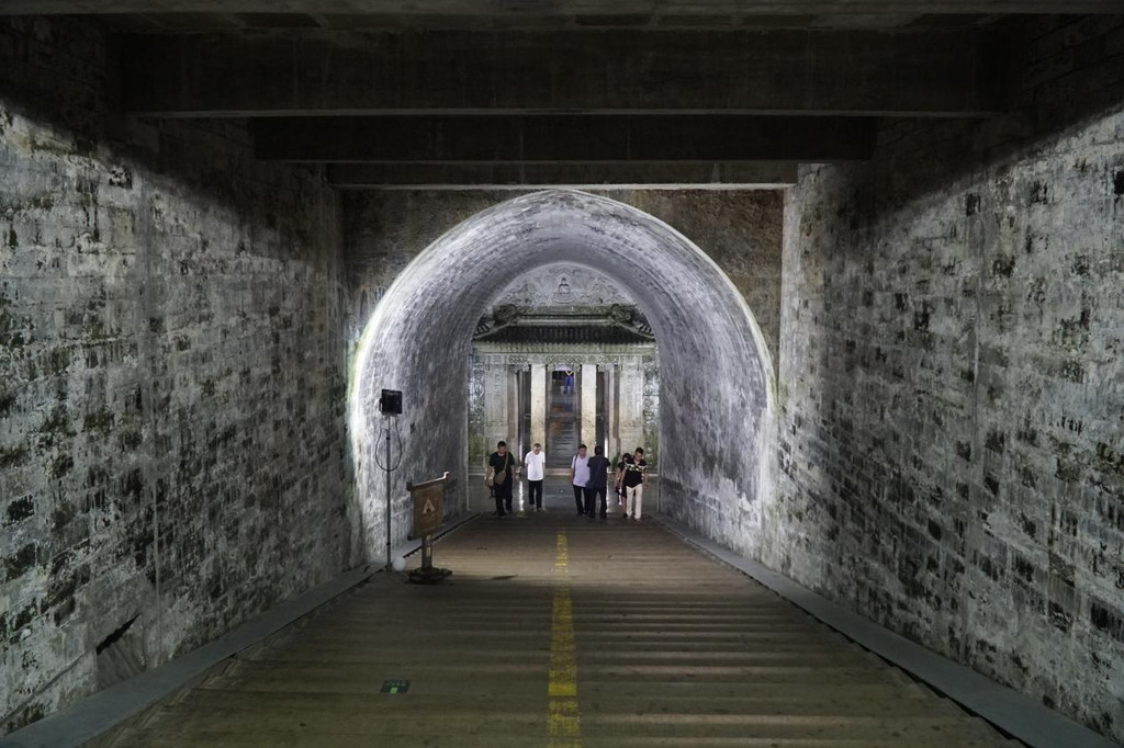 地宫也称玄宫,俗称地下宫殿,其地宫为传统的拱券式石结构,有九道券、四道石门。由于第一道石门门楼处有了裂痕,所以当年嘉庆皇帝下令加上两根石柱,起加固的作用。每扇石门均由整块青白玉石雕琢而成,八扇石门刻有八尊菩萨,两侧石壁上雕刻着四大金刚。