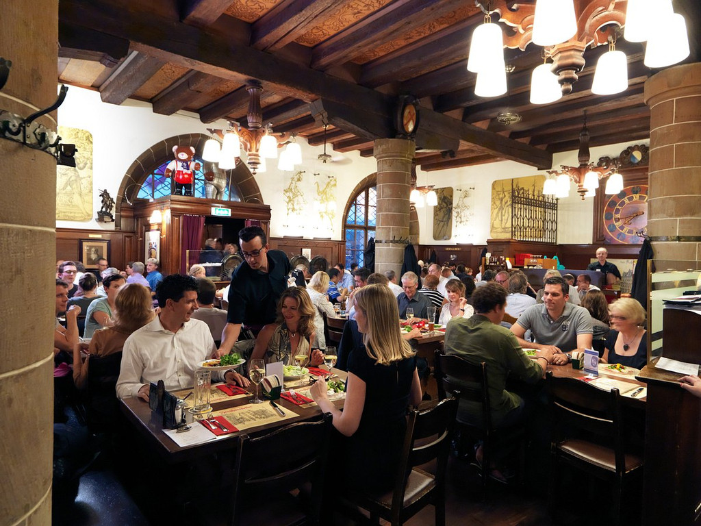 特色菜是美味的烤肉,包括岩龙虾和其他海鲜。另一个想法是,我知道这可能有点旅游化,就是餐厅 Zeughauskeller。这家餐厅的前身是军械库,有石柱和横梁天花板。每月都会供应一种香肠,所以你要知道,这里的食物真的很丰盛。这里总是人头攒动!